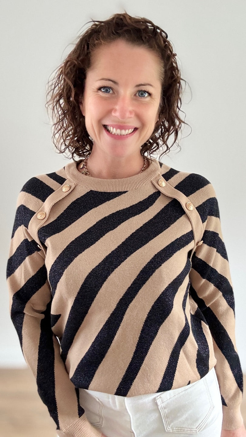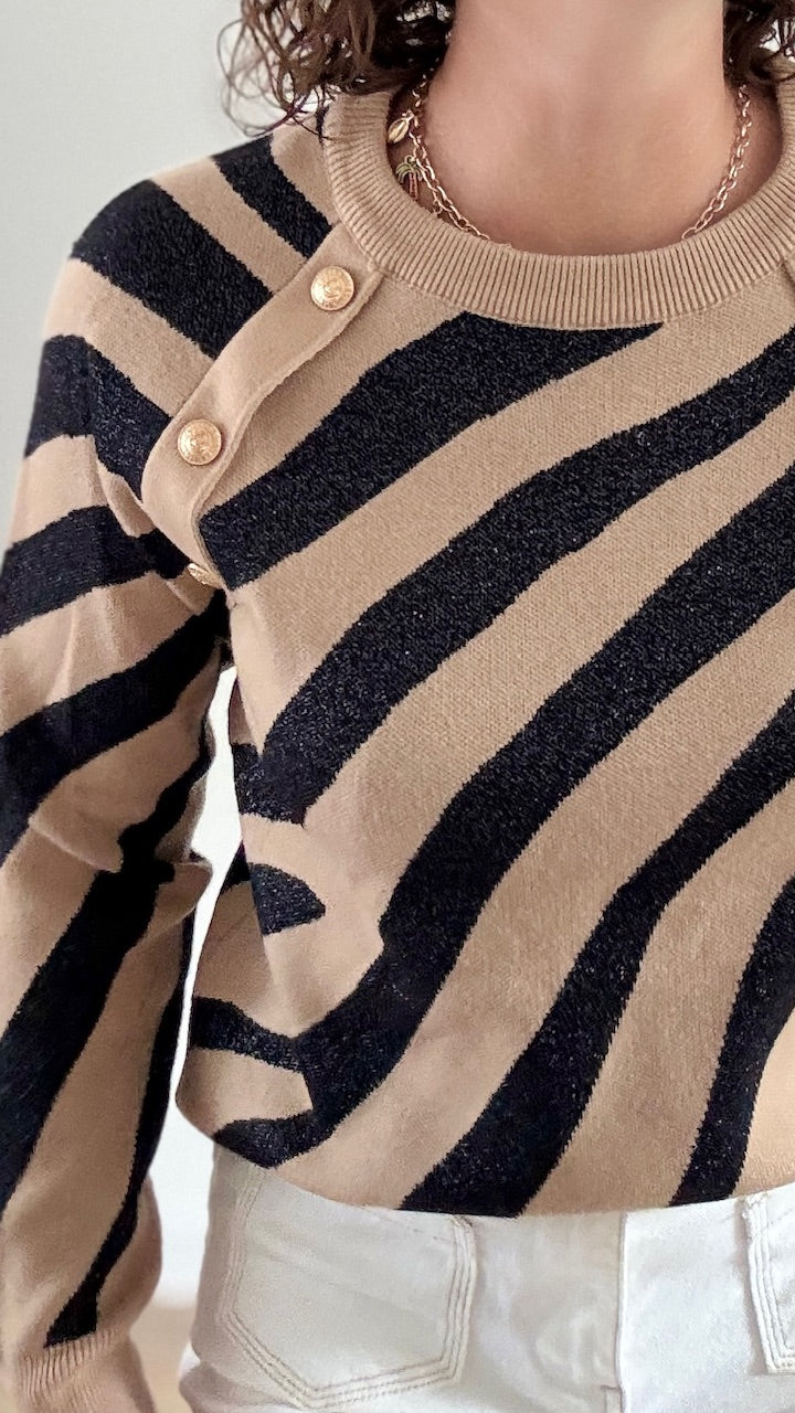 Optez pour un look audacieux avec ce pull court zébré noir et doré, une pièce forte qui allie imprimé tendance et finitions luxueuses. Son motif zébré noir rehaussé de rayures dorées pailletées capte la lumière à chaque mouvement, tandis que les boutons dorés décoratifs à l'épaule apportent une touche de raffinement discret.