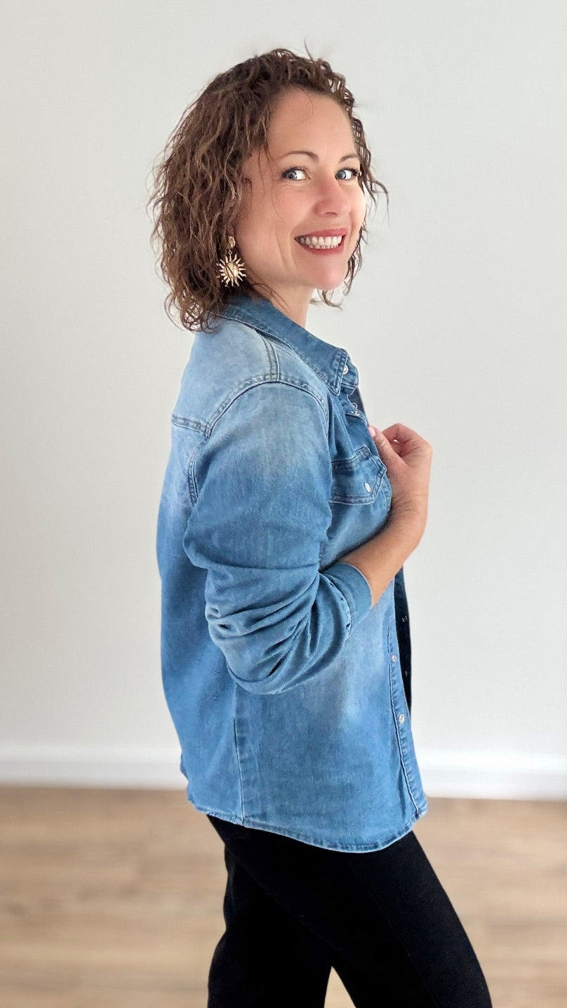 Cette chemise en jean combine un style classique avec des détails modernes pour un look simple et sophistiqué. Le denim bleu profond s’adapte à toutes les saisons et silhouettes, tandis que les boutons pression blancs nacrés apportent une touche élégante et discrète.