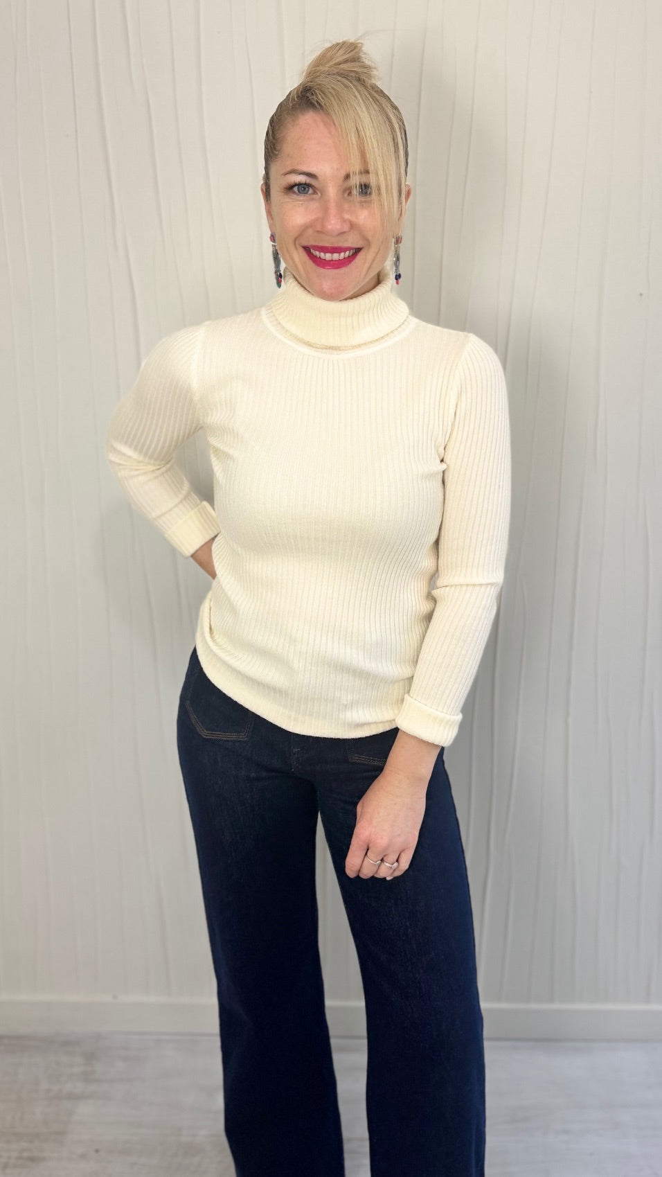 Pull fin col roulé écru